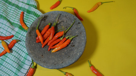 Red hot chili peppers on a stone plate on a yellow background. some red chilies on a pestle with a yellow background