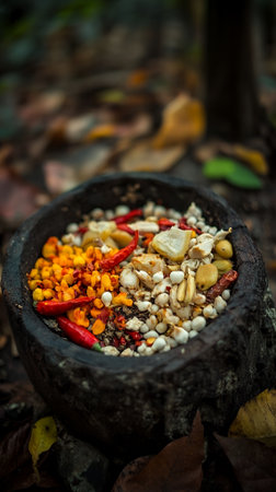 Vibrant Spice Blend in Rustic Stone Mortar Bowl Autumn Leaves Background red mix food life dish meal
