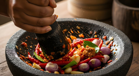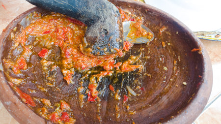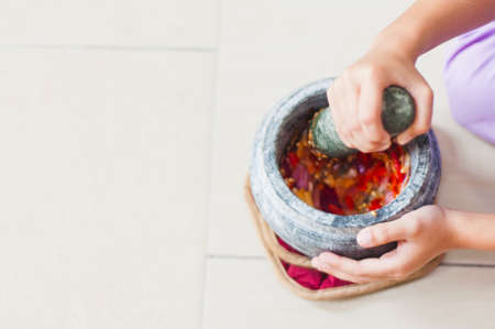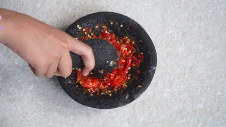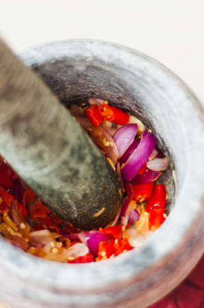 Chili and tomato sauce is being mashed on a stone mortar. Focus selected. Top view