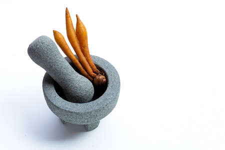 Fingerroot or boesenbergia in rock mortar with pestle on white