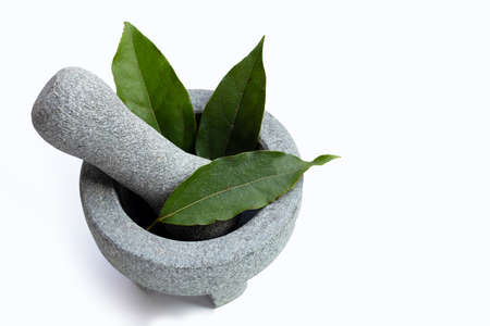 Tiliacora triandra green leaves with rock mortar with pestleon white background.