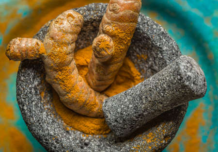 Picture of traditional stone mortar and pestle on blur background.
