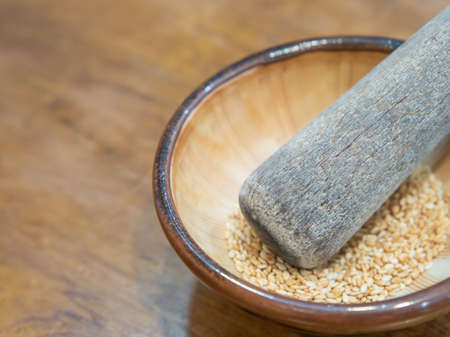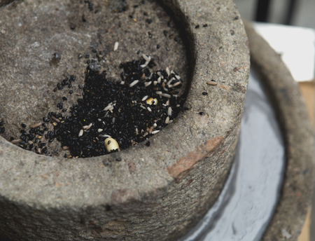 Roasted sesame seeds in Japanese blow with crushed wood sticks. Selective focus.