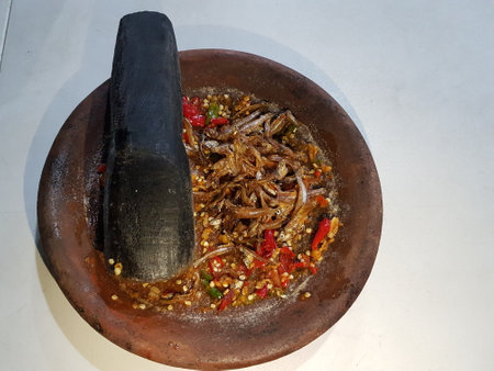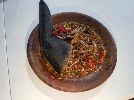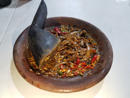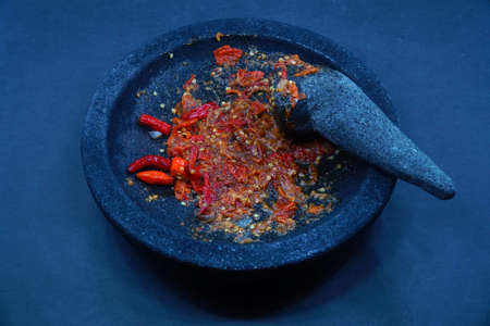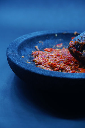 A mortar and pestle or lesung batu in Malay with crushed chilies, fried shallots and shrimp paste mixed together. Soft focus, shallow depth of field.