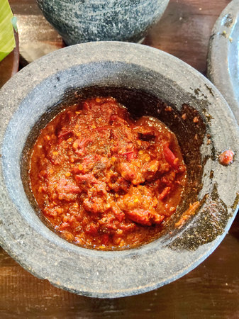 Authentic Sundanese Red Chili Paste in Stone Mortar Bowl