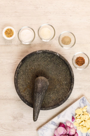 Top View Cobek and Munthu , Stone Craft Made for Mashing Seasoning Purpose