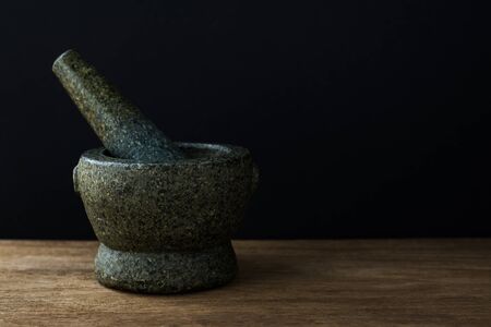 Stone Mortar on the wooden table,Black background with copy space