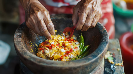 Close-up of Thai chef preparing spicy fried rice in mortar.