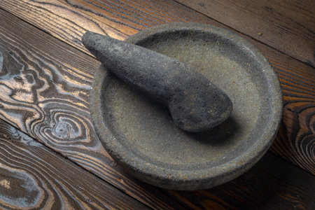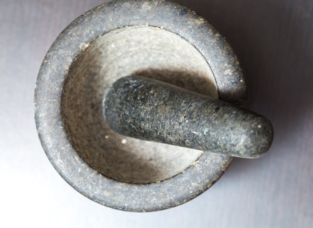 stone mortar and pestle on the table, close-up