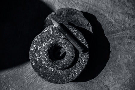 Close up of hand grinding stone or hand grinder or old motor or pestle or grain mills on rough surface still used in some of the villages of Asia and India.