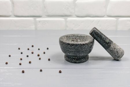 Granite gray mortar with pestle on a gray wooden table background on a white brick wall background. Stone mortar is an important tool in cooking pepper food