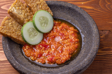 sambal or traditional chili sauce from Indonesia, freshly made using a stone mortar and pestle with fried tempeh and cucumber