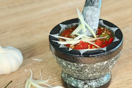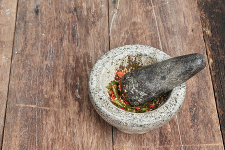 chilli pepper in stone mortar on the wooden table, paste spicy herb ingredient foodThailand ancient style. Image Top view