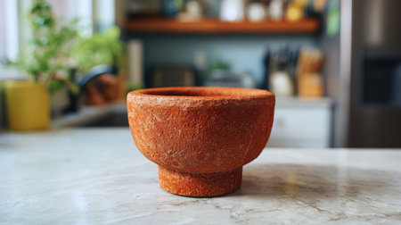 A rustic terracotta bowl sits elegantly on a kitchen counter, showcasing its warm, earthy texture. This piece adds charm and style to modern home decor.