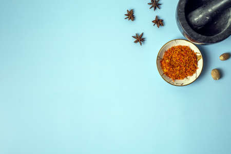 Set of spices isolated on blue background