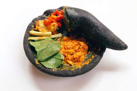 Traditional stone mortar and pestle from Asia with spicy ingredients chilli, yellow seasoning, leaf, leak leaf from Indonesia isolated on white background