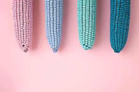 Corn-based artistic arrangement. Flat food presentation. Macro artistic idea.