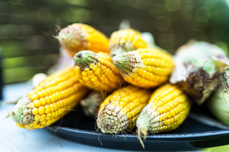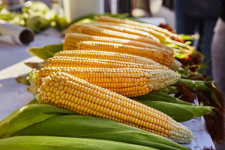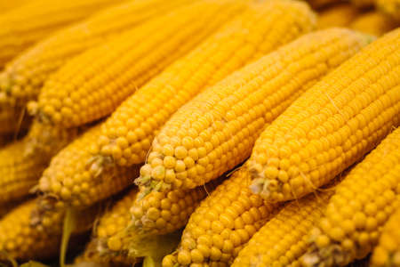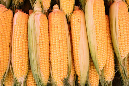 Fresh raw yellow corn in the street market. Organic product suitable for vegeterians and vegans. Healthy food concept background