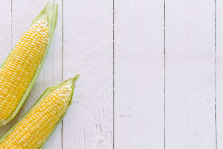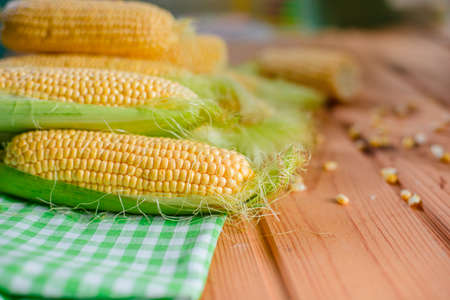Fresh corn on the cob on a rustic wooden table, close up. Delicious and healthy food.