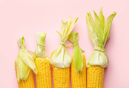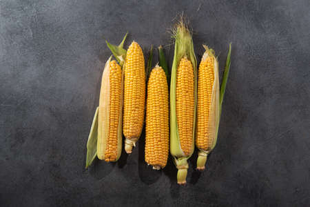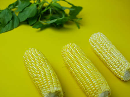 Color Veggies. corn background. Close-up of fresh corn on the cob on a yellow background. The texture of corn. Bright summer background, with summer vegetables and rhythm in the frame. stylish