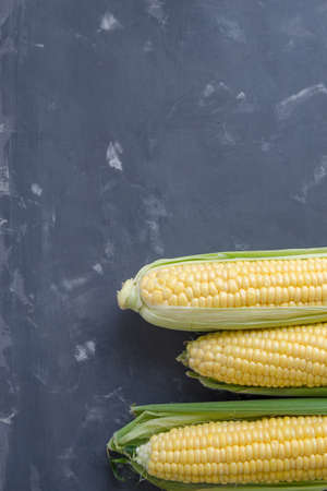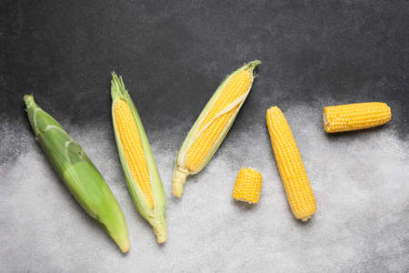 Fresh corn on cobs on light grey concrete background, closeup, top view, copy space