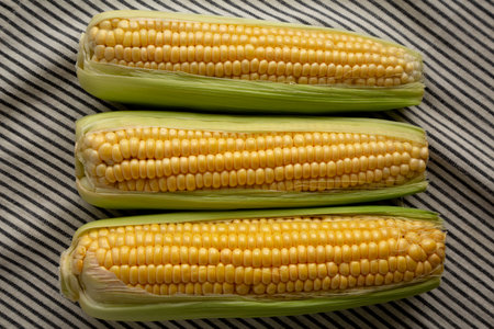 Fresh Raw Organic Corn on the Cob in the Husk, top view.