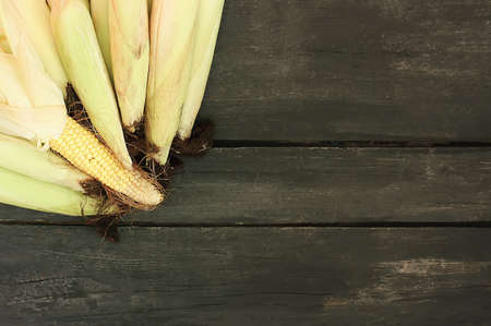 Group sweet corn on the table. Fresh corn on cobs on rustic wooden table, closeup
