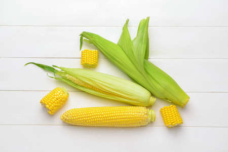 Ripe sweet corn on the cob on a light background. A popular cereal grain close-up.