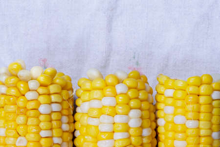 Raw, young, yellow corn in a row on the counter of the oriental market.
