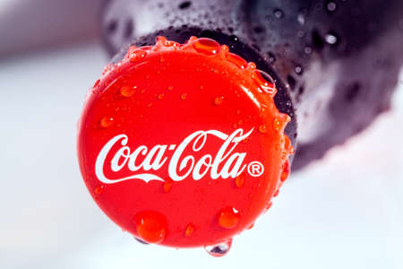 Tyumen, Russia-January 19, 2022: Coca Cola cap logo close up with water drops. selective focus