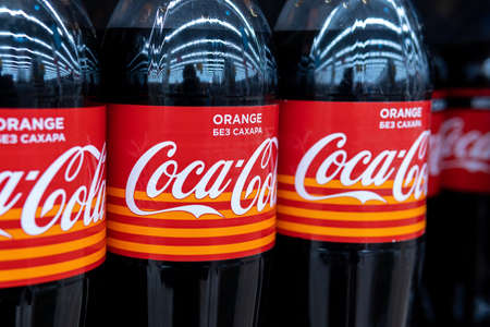 Tyumen, Russia-February 27, 2021: coca-Cola orange without sugar. label close-up