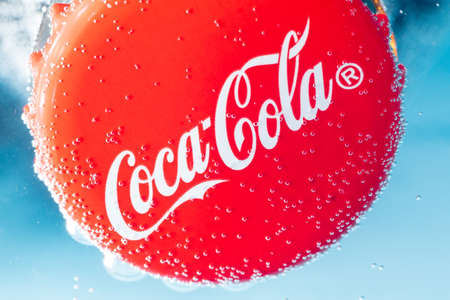 Tyumen, Russia-January 19, 2022: Coca-Cola classic cap close up in water. Coca cola is the world's most selling carbonated soft drink
