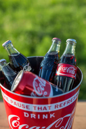 Atlanta USA May 1 2020 Coke bucket full of Coca Cola bottles and cans outdoors