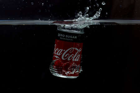 Close up view of can falling in water. Coca cola. Sweden Uppsala. 14/03/2020.