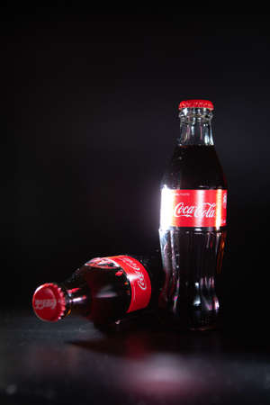 Kuala Lumpur, Malaysia - April 02,2020 : Coca - Cola carbonated soft drink on colorful background. Selective focus