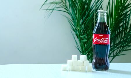 Kazakhstan Almaty, October 18, 2019. A bottle of Coca-Cola stands on a table with refined sugar cubes on a light background and a green plant.