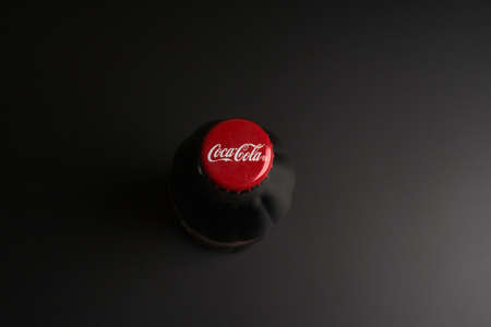 Moscow, Russia - may 20 2021: Coca-Cola bottle on black background top view.