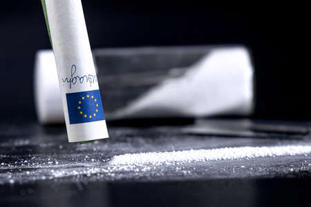 cocaine or speed in a line. addict with euro bill for snorting, drug abuse concept close-up