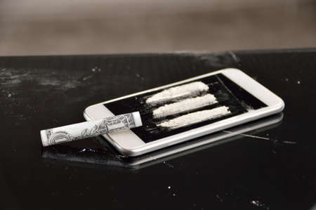 Close-up of drug addict snorting a cocaine stripe over the smart phone