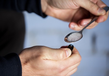 Addict/junkie man preparing drugs. The concept of crime and drug addiction.