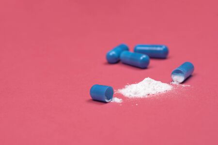 Medical background. Open blue capsule pill on pink background. Blue capsules pill spread on fuchsia or pink background with copy space. Macro photo