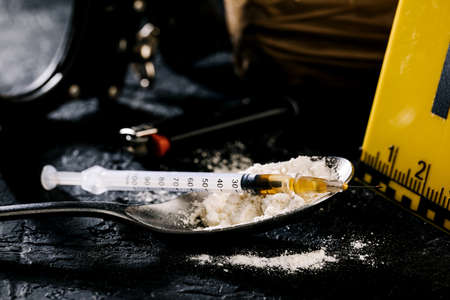 drugs in the form of a white powder on a black background, next is a syringe