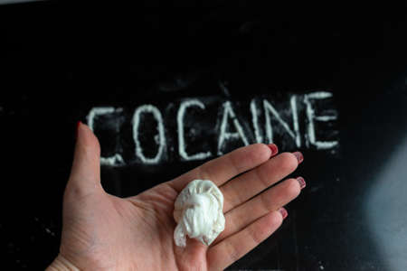 cellophane bag with white powder (drug) on the female palm, the word cocaine on a black background