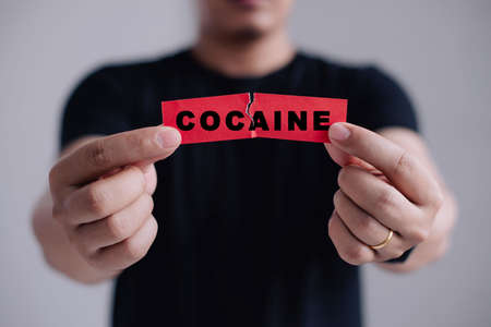 Stop drug addiction concept. Man with a stethoscope Tear the red paper with the word cocaine.