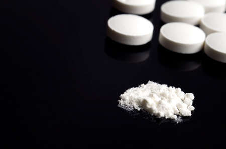 White drugs and pills on a black background, close-up