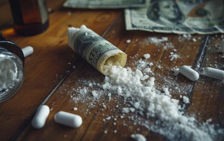 social problem of drug addiction table with the track of a strange powder and twisted bill