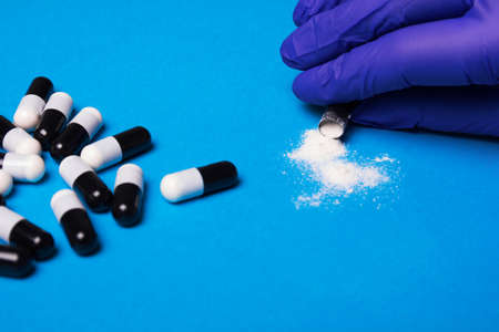 Pills and powder on a blue background. Selective focus.