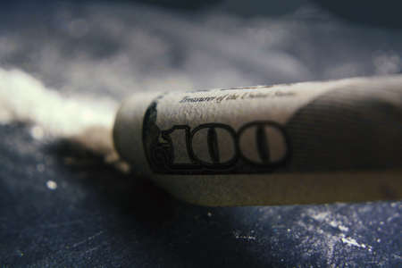 Cocaine Sniffing Closeup, Rolled Banknote for Snorting Line of Cocaine, Cocaine Drug Addiction