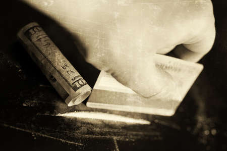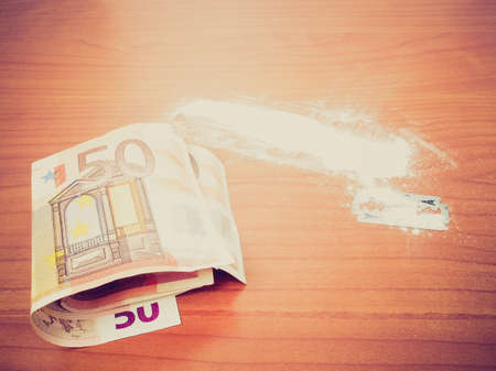 social problem of drug addiction table with the track of a strange powder and twisted bill