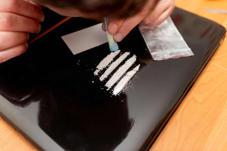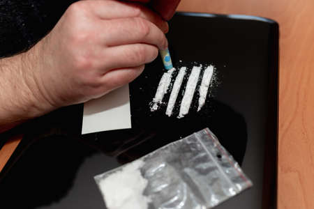 Drug addict. Drug abuse, man taking drugs, snorting lines of cocaine white powder, closeup.